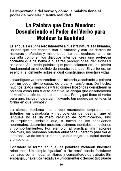 Sumérgete en un viaje transformador con «El Poder del Verbo: Cómo La Palabra Crea Nuestra Realidad«. Este libro es una guía profunda que explora cómo las palabras que elegimos y los pensamientos que cultivamos tienen la capacidad de moldear nuestras vidas. A lo largo de sus páginas, descubrirás cómo la expresión verbal no solo comunica, sino que crea y transforma nuestra realidad interna y externa.