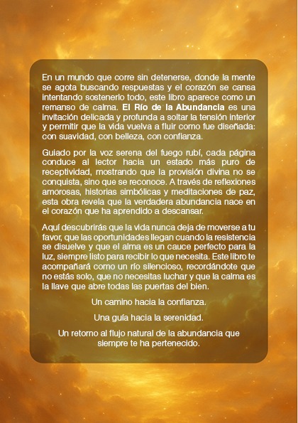 El Río de la Abundancia es una obra espiritual profunda y serena que invita a transformar la relación con la vida, la provisión y la confianza interior. Escrita desde la energía del Fuego Oro Rubí de Paz y Abundancia, esta lectura acompaña al lector a soltar la resistencia interior y a reconectar con el flujo natural del bien.