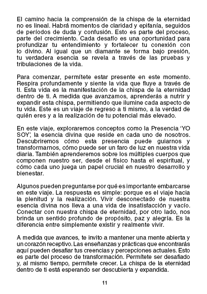 Ideal tanto para principiantes como para aquellos más avanzados en su camino espiritual, «La Chispa de la Eternidad» es una guía esencial para quienes buscan una mayor comprensión de su naturaleza divina y desean vivir desde un lugar de autenticidad y verdad.