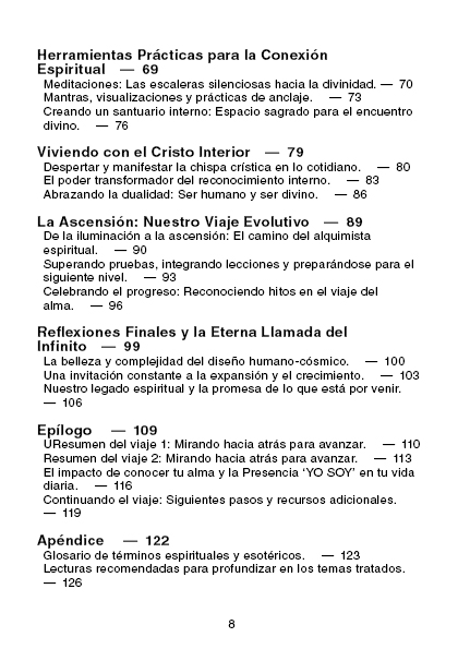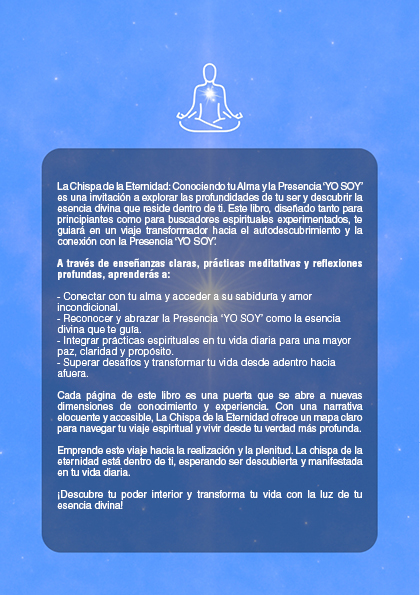 Este libro combina enseñanzas espirituales, meditaciones guiadas y prácticas concretas diseñadas para ayudarte a experimentar una transformación espiritual significativa. Aprenderás sobre la importancia de conocer tu alma, cómo conectarte con la Presencia YO SOY, y cómo estas enseñanzas pueden aplicarse en tu vida diaria para alcanzar un mayor bienestar, paz interior y sentido de propósito.