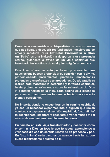 En sus páginas, encontrarás una exploración inclusiva y accesible de la espiritualidad, libre de ataduras religiosas y enfocada en la esencia de Dios como una presencia omnipresente, omnipotente y omnisciente que permea cada rincón del universo. A través de meditaciones guiadas, ejercicios prácticos y reflexiones profundas, «Luz Infinita» ofrece herramientas para integrar la espiritualidad en tu vida diaria, enriqueciendo tu camino hacia una vida más plena y consciente.